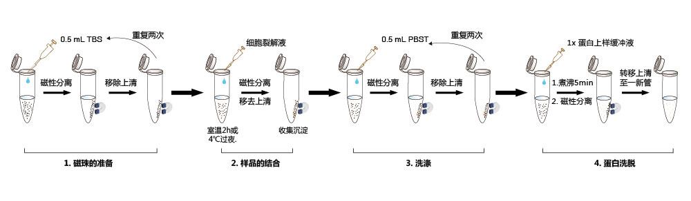 2、加入500 μL TBS (50 mM Tris HCl, 150 mM NaCl, pH 7.4),用移液槍輕柔吹打重懸磁珠,磁力架上靜置1~2 min(也可適當延長至5min),去除上清,重復上述步驟兩次。