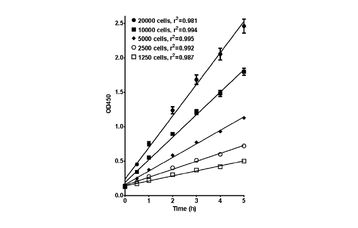 圖3: 使用Selleck Cell Counting Kit-8 (CCK-8)進(jìn)行細(xì)胞計(jì)數(shù)和OD值的比較。按不同的密度將HEK293細(xì)胞接種在96孔板的100 μl培養(yǎng)基中(每個(gè)樣品進(jìn)行三個(gè)重復(fù)). 培養(yǎng)16h后,在孔中添加10 μl Cell Counting Kit-8 (CCK-8),并在培養(yǎng)箱按指定時(shí)間進(jìn)行孵育。用培養(yǎng)基作為空白對(duì)照,在酶標(biāo)儀450 nm下檢測(cè)光吸收值。