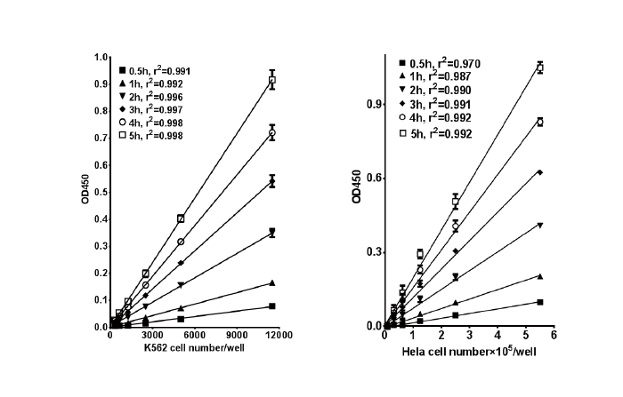 圖2: 使用Selleck Cell Counting Kit-8 (CCK-8)進(jìn)行細(xì)胞計(jì)數(shù)和OD值的比較。按不同的密度將K562和Hela細(xì)胞接種在96孔板的100 μl培養(yǎng)基中(每個(gè)樣品進(jìn)行三個(gè)重復(fù)). 培養(yǎng)16h后,在孔中添加10 μl Cell Counting Kit-8 (CCK-8),并在培養(yǎng)箱按指定時(shí)間進(jìn)行孵育。用培養(yǎng)基作為空白對(duì)照,在酶標(biāo)儀450 nm下檢測(cè)光吸收值。