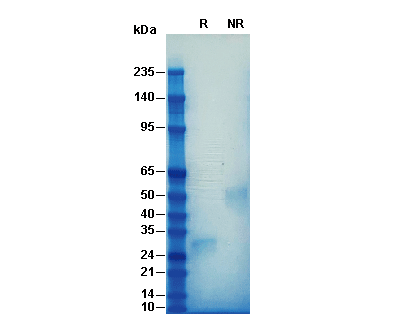 • Recombinant Mouse VEGF 164 Protein, CF (HEK293)on SDS-PAGE under reducing (R) and non-reducing (NR) conditions. The gel was stained with Coomassie Blue. The purity of the protein is greater than 95%.